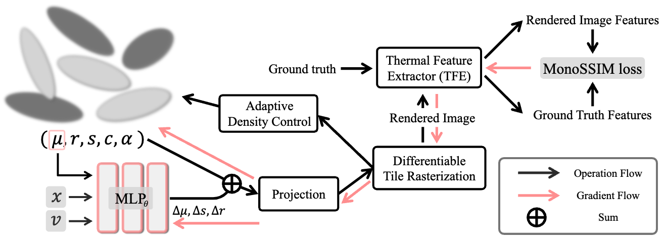 Overview of Veta-GS pipeline. We utilize camera position x, viewing direction v, time t, and 3D Gaussian’s position μ with positional encoding as input to deform 3D gaussians, by obtaining the offset (δμ, δr, δs). Further we introduce Thermal Feature Extractor (TFE) and MonoSSIM loss which focus on edge, frequency, and appearance to show robustness rendering.